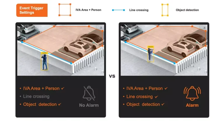 Active grabaciones, alertas, notificaciones y más con análisis sin licencia. Combine hasta 3 condiciones de evento para crear activadores personalizados y maximizar la eficiencia del sistema.